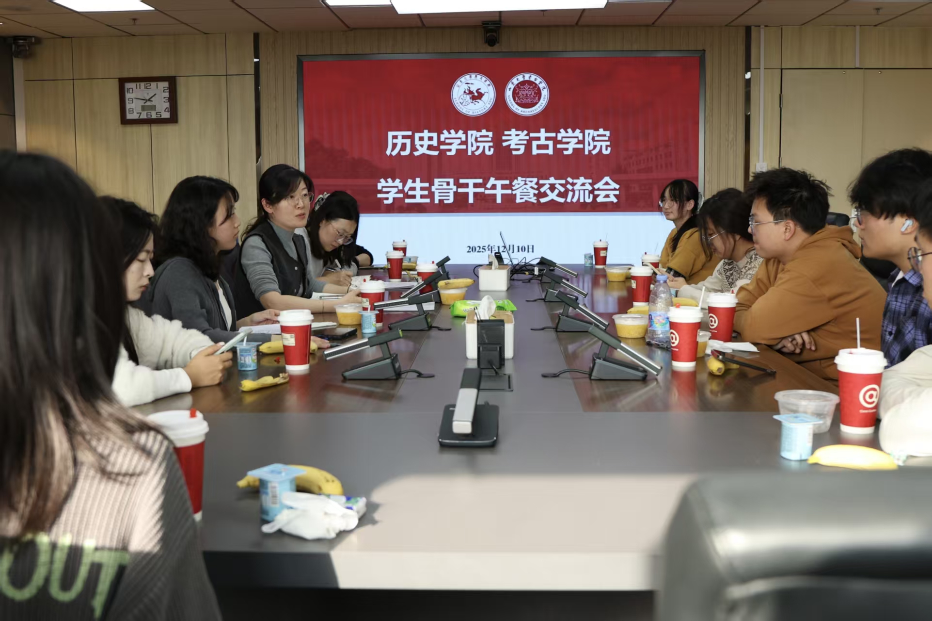 12月10日,历史学院、木瓜视频 举行学生骨干午餐交流会,历史学院与木瓜视频 党委副书记李一楠、团委负责人王兴兴、辅导员刘子菁和15名学生骨干参加活动,围绕学生工作经验、组织联动、品牌建设与未来发展等深入交流。