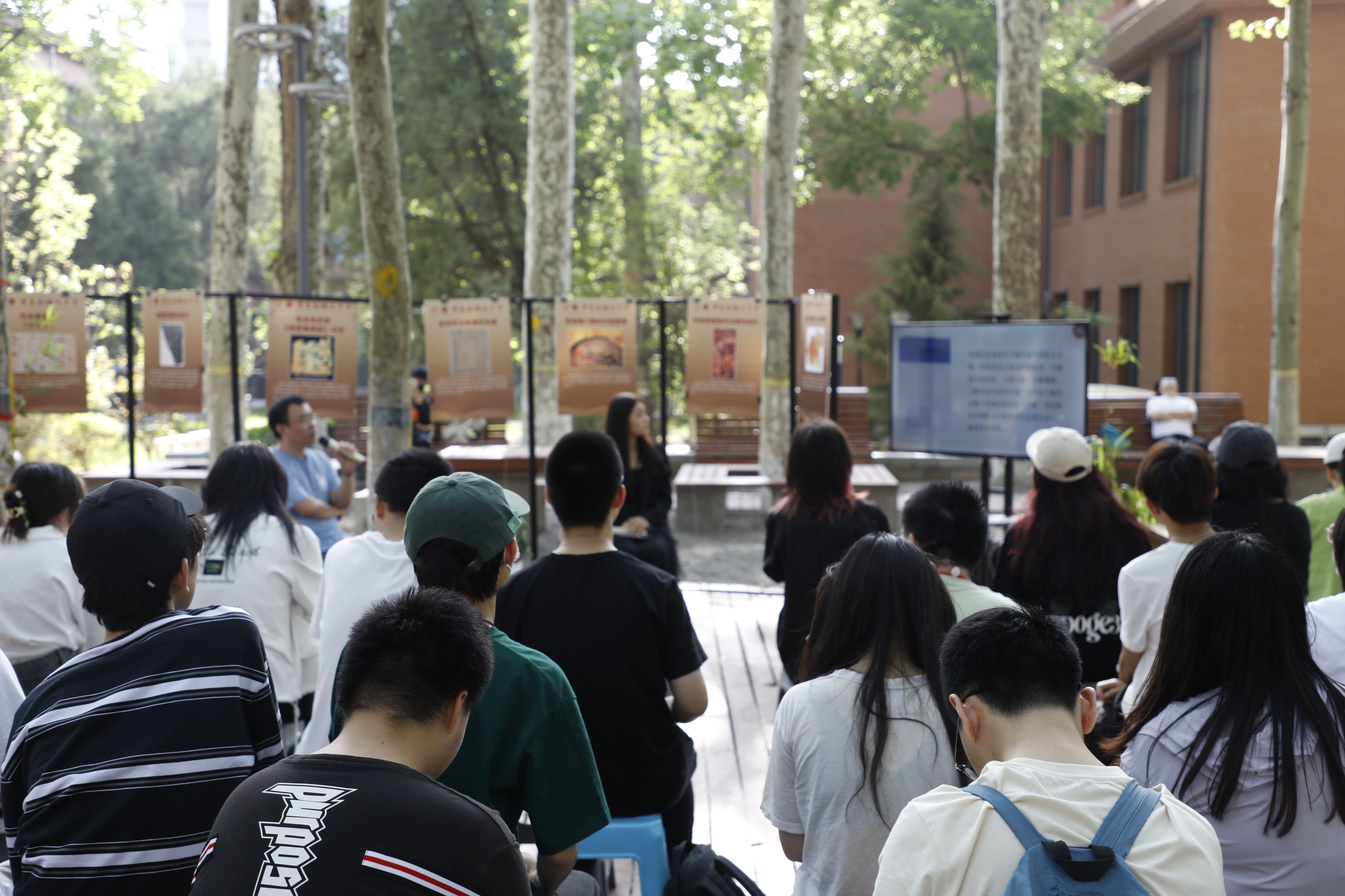 此次活动设置了敦煌壁画线描和泥板壁画临摹活动区,吸引了众多同学参与体验,他们用心描绘着一笔一线,力求还原古代壁画的神韵,相关同学也上台进行了作品展示和心得分享。