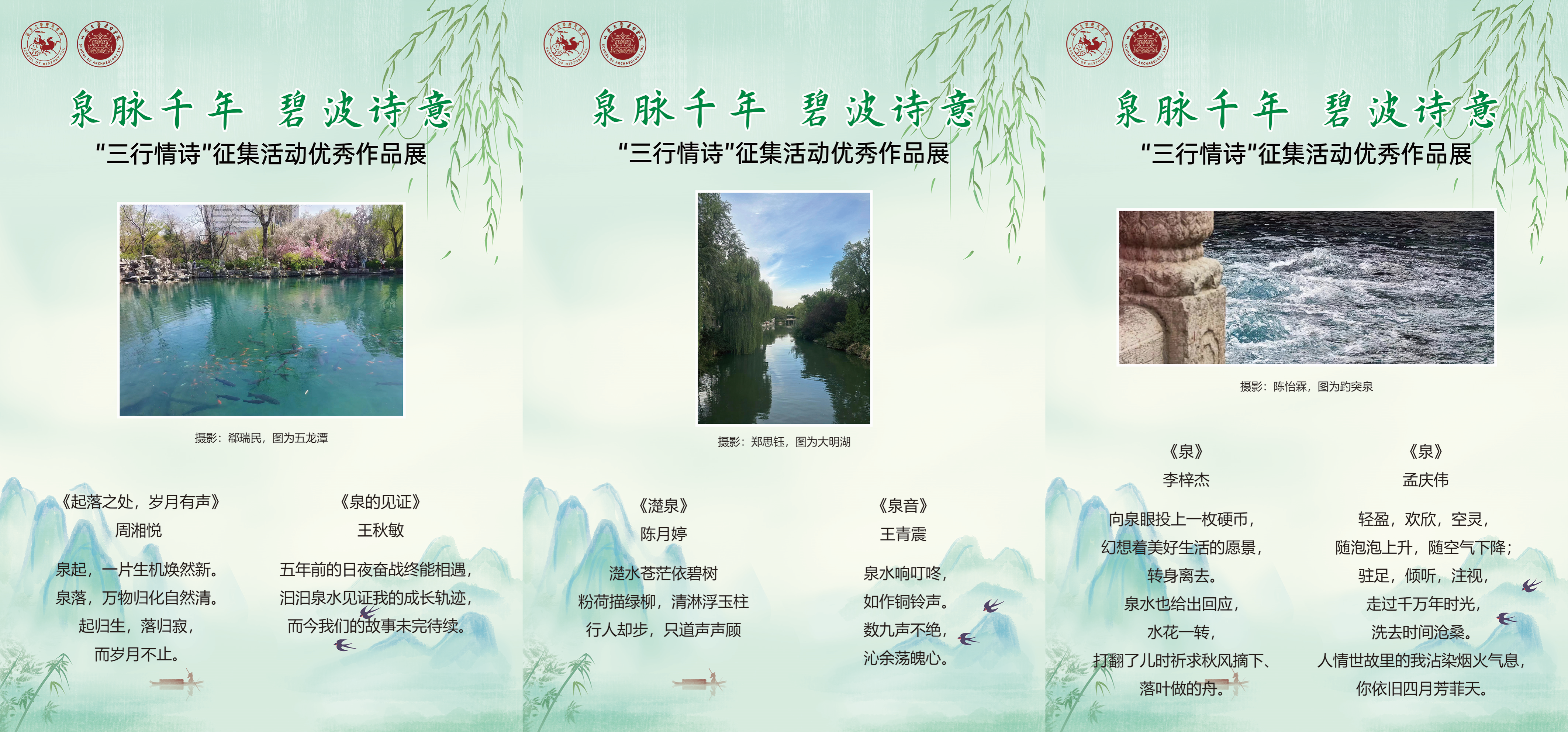 泉脉千年,碧波诗意。“三行情诗”优秀作品展以泉城景观为创作对象,以三行情诗为载体,引导学生与历史对话,感知古城的历史温度,通过追寻济南泉城记忆,进一步呼吁保护、利用、传承好泉城文化遗产,延续历史文脉。