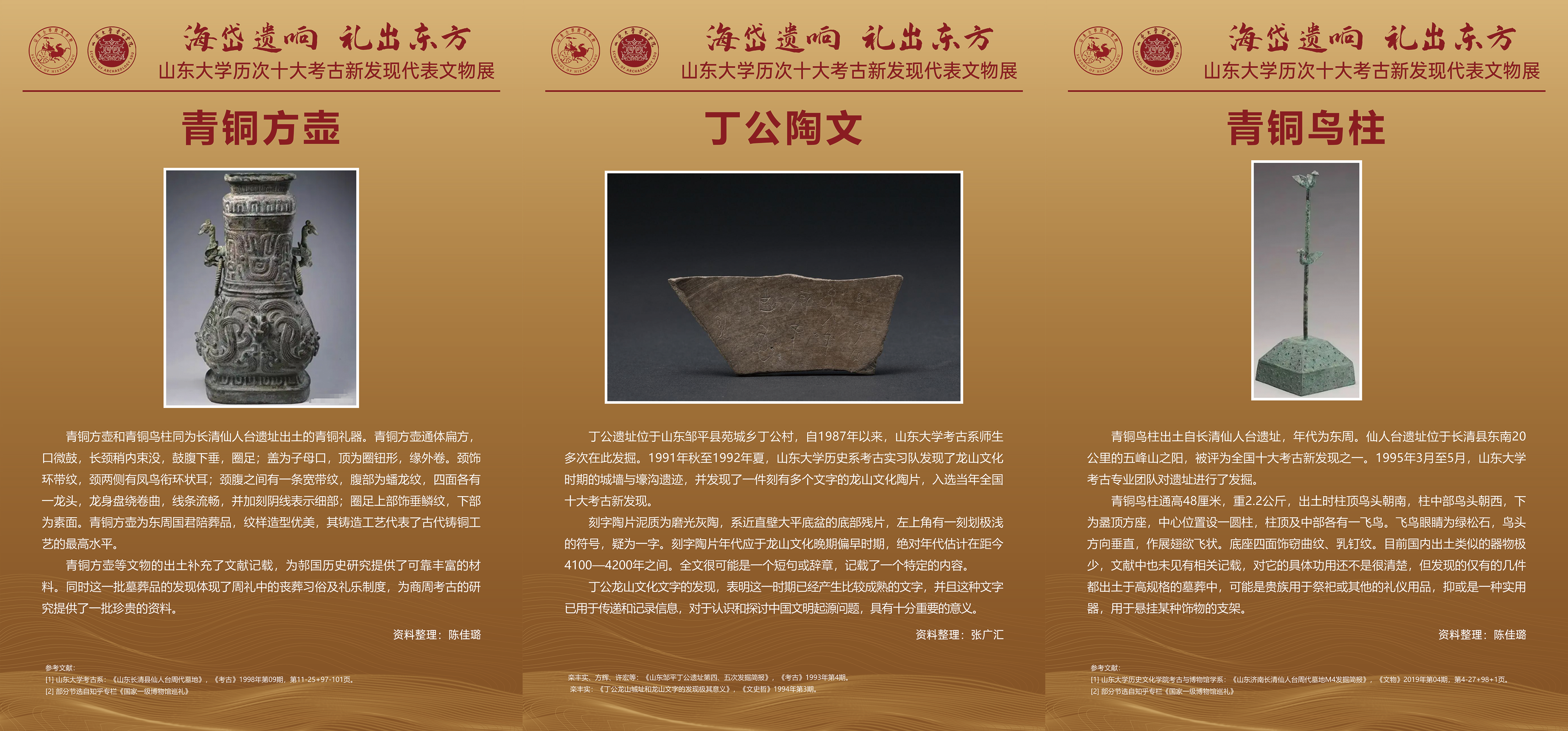 历次十大考古新发现代表文物为内容主体,由历届考古专业本科生搜集、整理完成,展览以图文形式展现了中华文明进程,诠释了山大考古人在中华文明探源中的生动实践和丰硕成果。