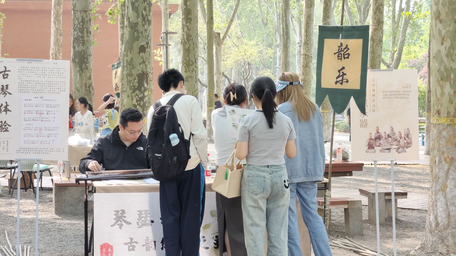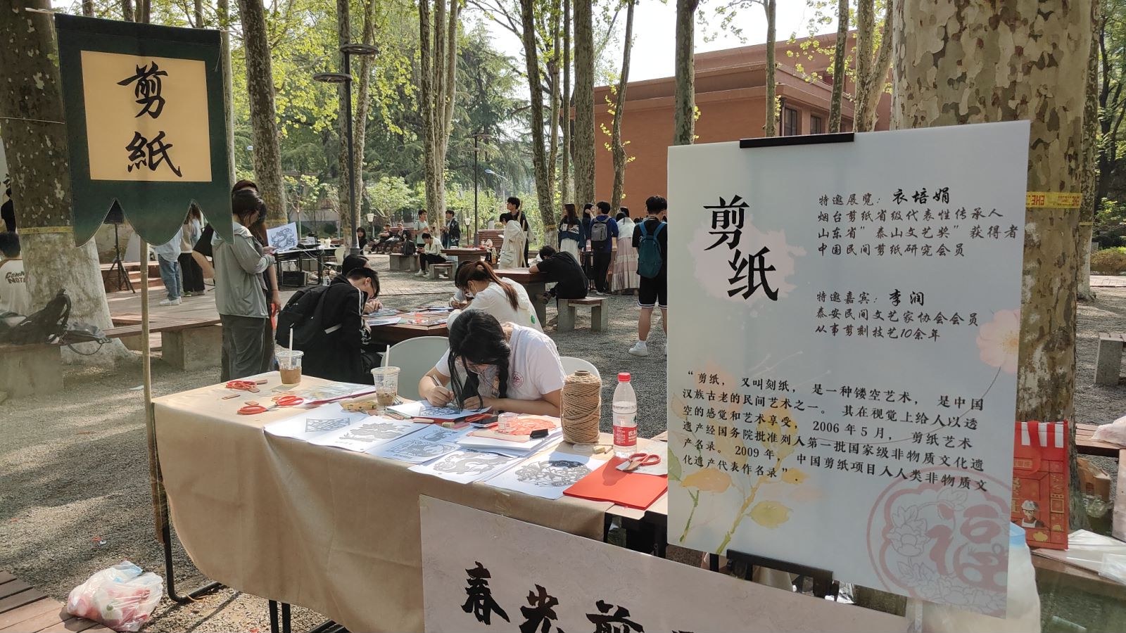 “山魂海韵”传统文化市集活动中,学院同学们精心筹备了剪纸、中药、乐器、绒花、面塑等多个活动展台,邀请非遗文化传承人参与讲解,挖掘中华优秀传统文化的丰富内涵;并在活动现场开展“小树林对诗”,在诗词中与古代圣贤进行校园“跨时空”对话。