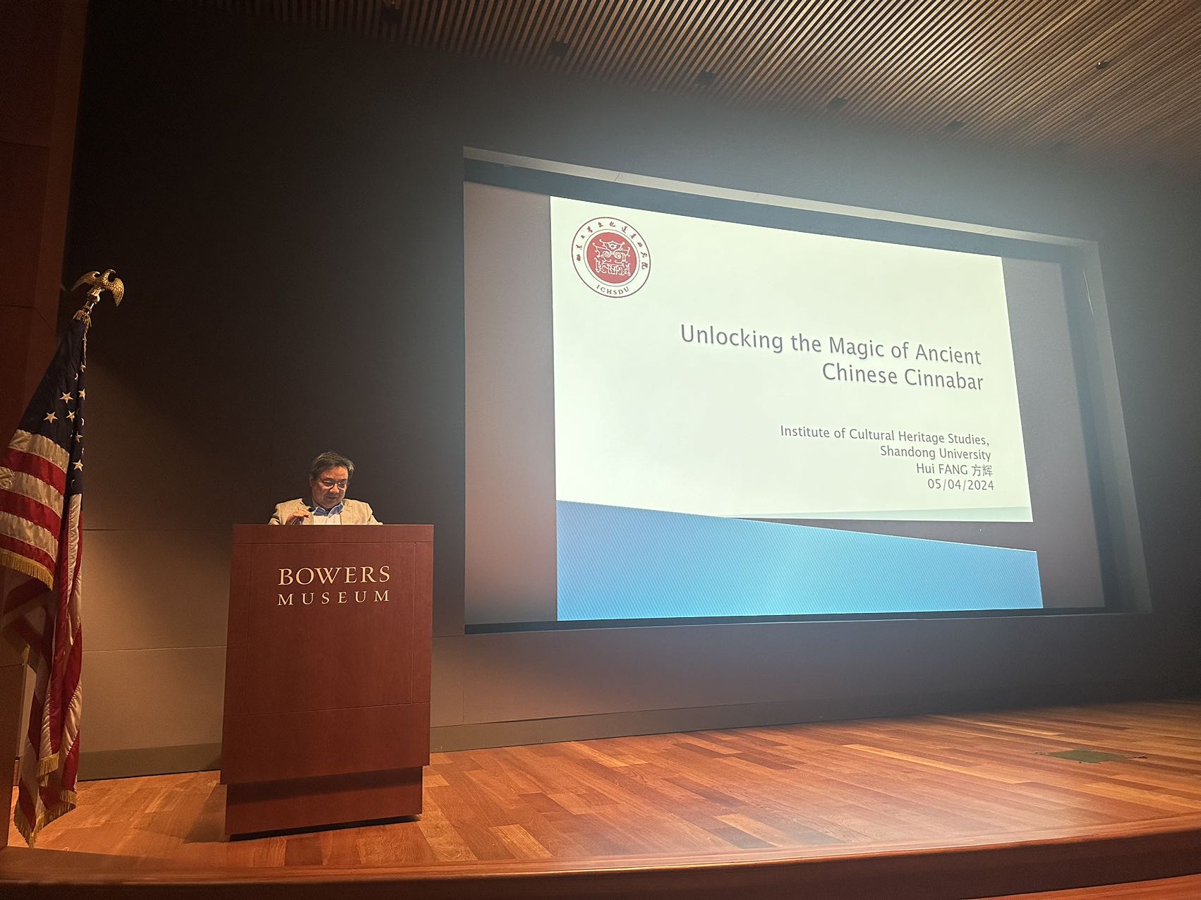 在洛杉矶访问期间,方辉教授应邀至宝尔博物馆和加州大学洛杉矶分校作学术报告。5月4日在宝尔博物馆讲座内容主要围绕中国古代朱砂的使用与象征意义的探讨,详细讲解了朱砂的功能性研究与中国境内朱砂的来源地问题。报告由宝尔博物馆焦天龙副馆长主持。宝尔博物馆成立于1936年,有专设的中国展厅,呈现自新石器时代以来的中华文明,曾组织过众多中国特展和其他与中国文化相关的展览。5月7日在加州大学洛杉矶分校讲座题目为“体质人类学的视角下的以夏变夷”,讲座分享了通过对中原和海岱地区史前至夏商时期遗址所出足部骨骼进行观察,探讨夏与东夷人群跽坐行为的发展与变化,指出在河南龙山时代晚期和二里头文化时期,跽坐行为开始普及,且逐渐规范化,该项研究启示我们可以从人群行为方式及礼节发展的角度对“夷夏之辨”做出新的探索。
