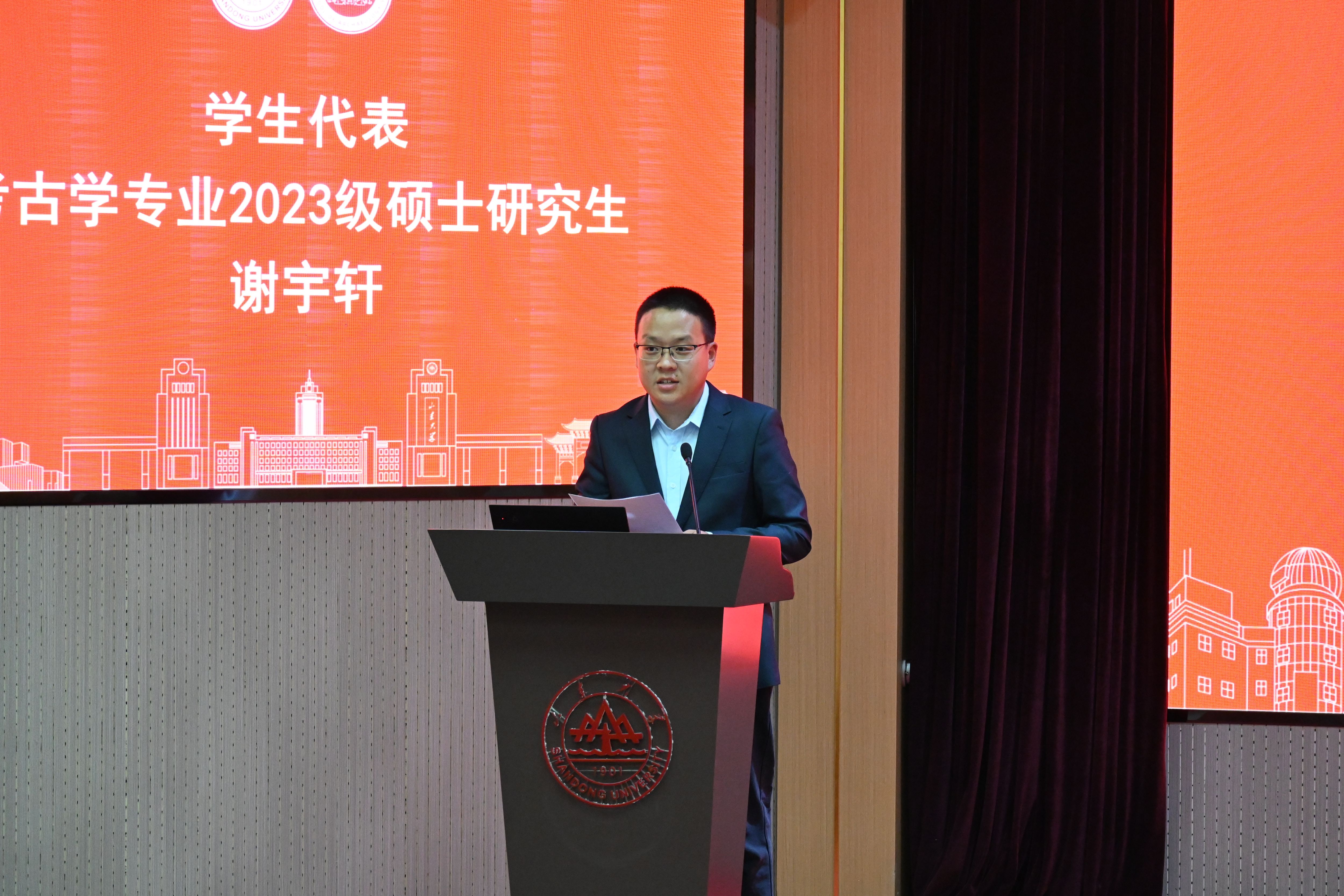 学生代表、考古学专业2023级硕士研究生谢宇轩分享了他在大汶口文化遗迹实习期间的感受与体会。他以自己的亲身经历呼吁新生们在田野中学习、在文献中学习、在实验室中学习,共同书写考古学新的齐鲁篇章。