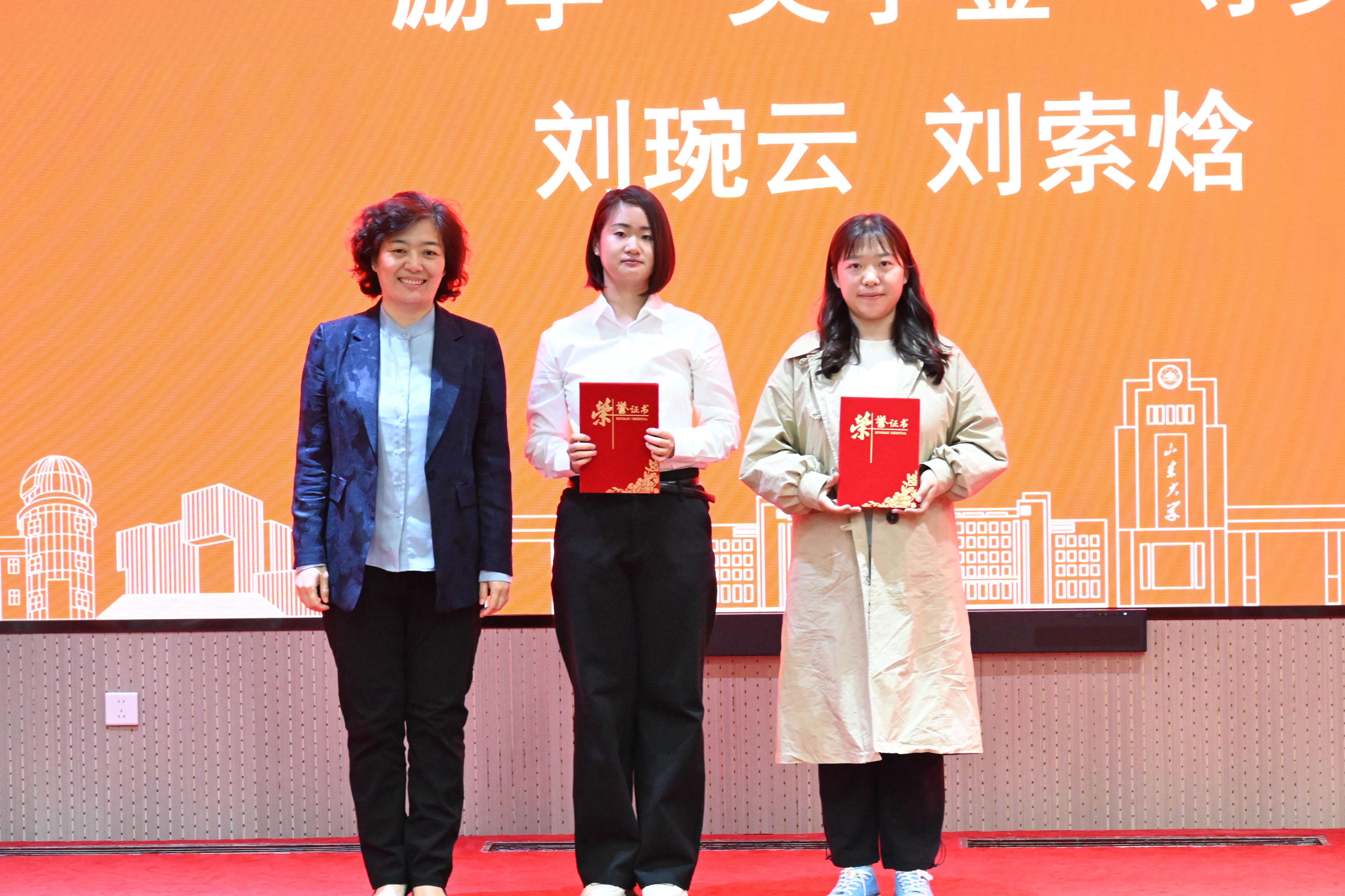 院长王芬、副院长唐仲明为“励学”奖学金获得者颁奖,并与获奖同学合影留念。