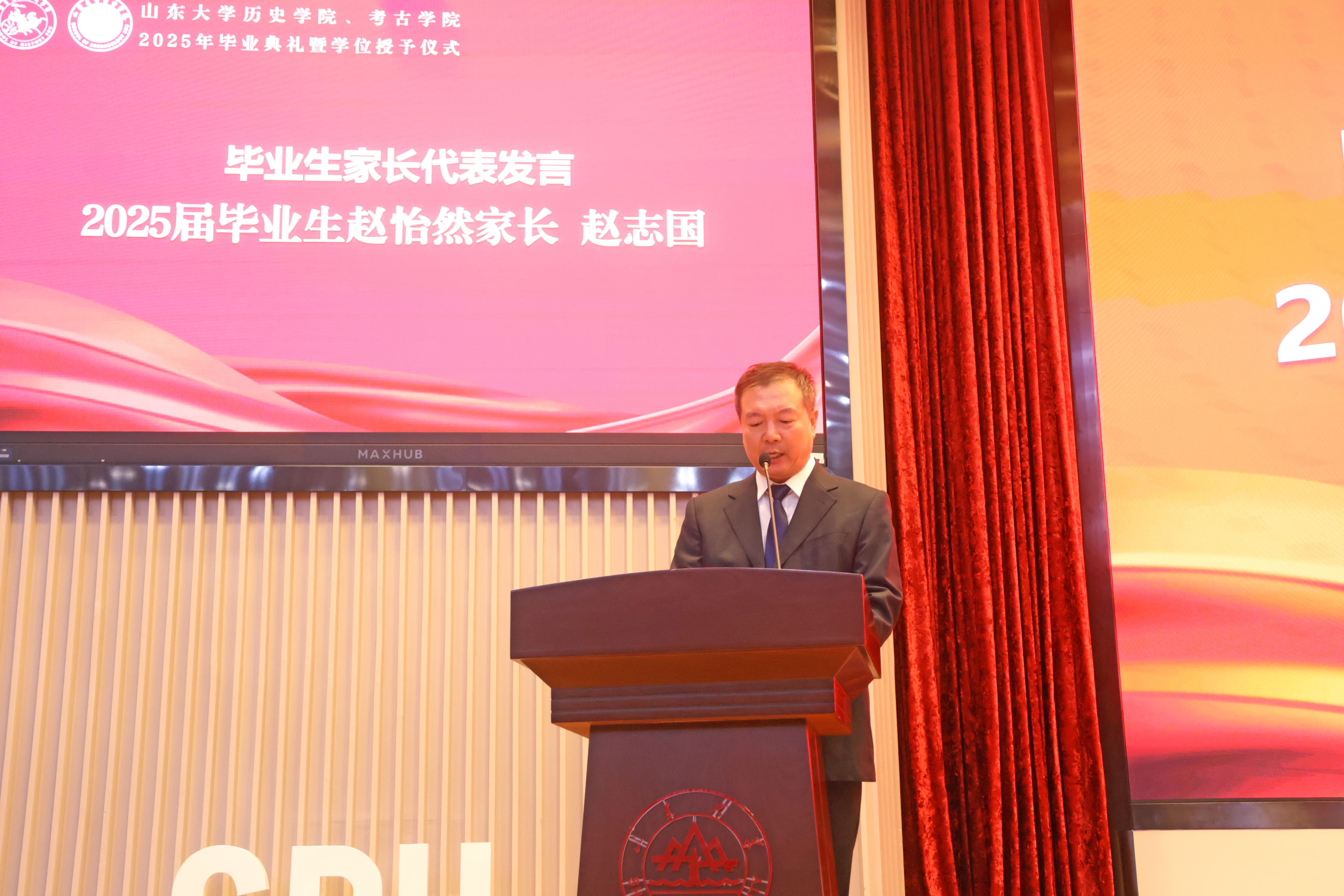 2022级考古学专业硕士研究生赵怡然家长赵志国作为毕业生家长代表,以“传承、成长、感恩”为关键词分享了家长们的心声。他感谢学院深厚的学术底蕴让孩子们触摸到了历史的温度、拥有了守护文明的精神底色,并代表家长们感谢木瓜视频