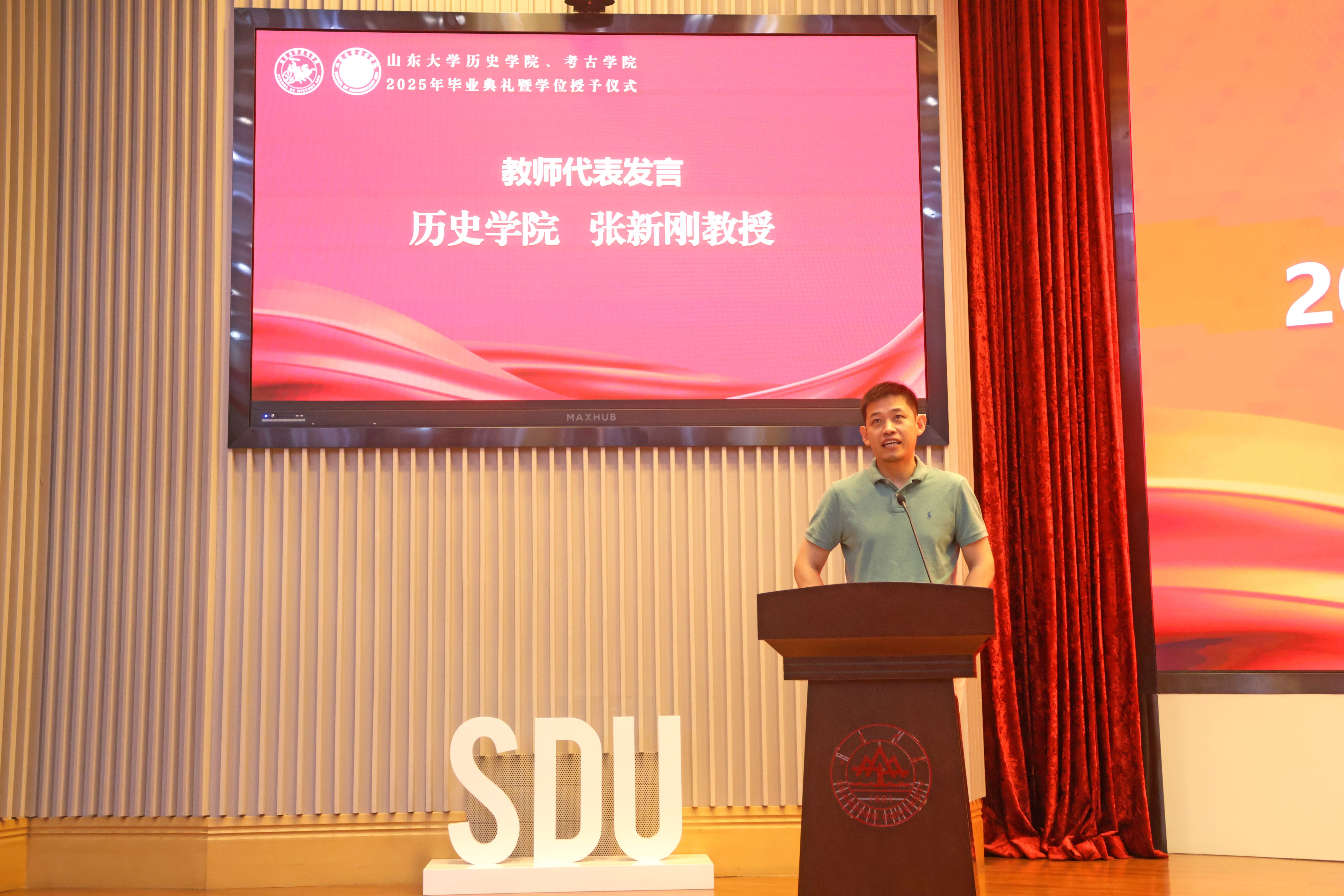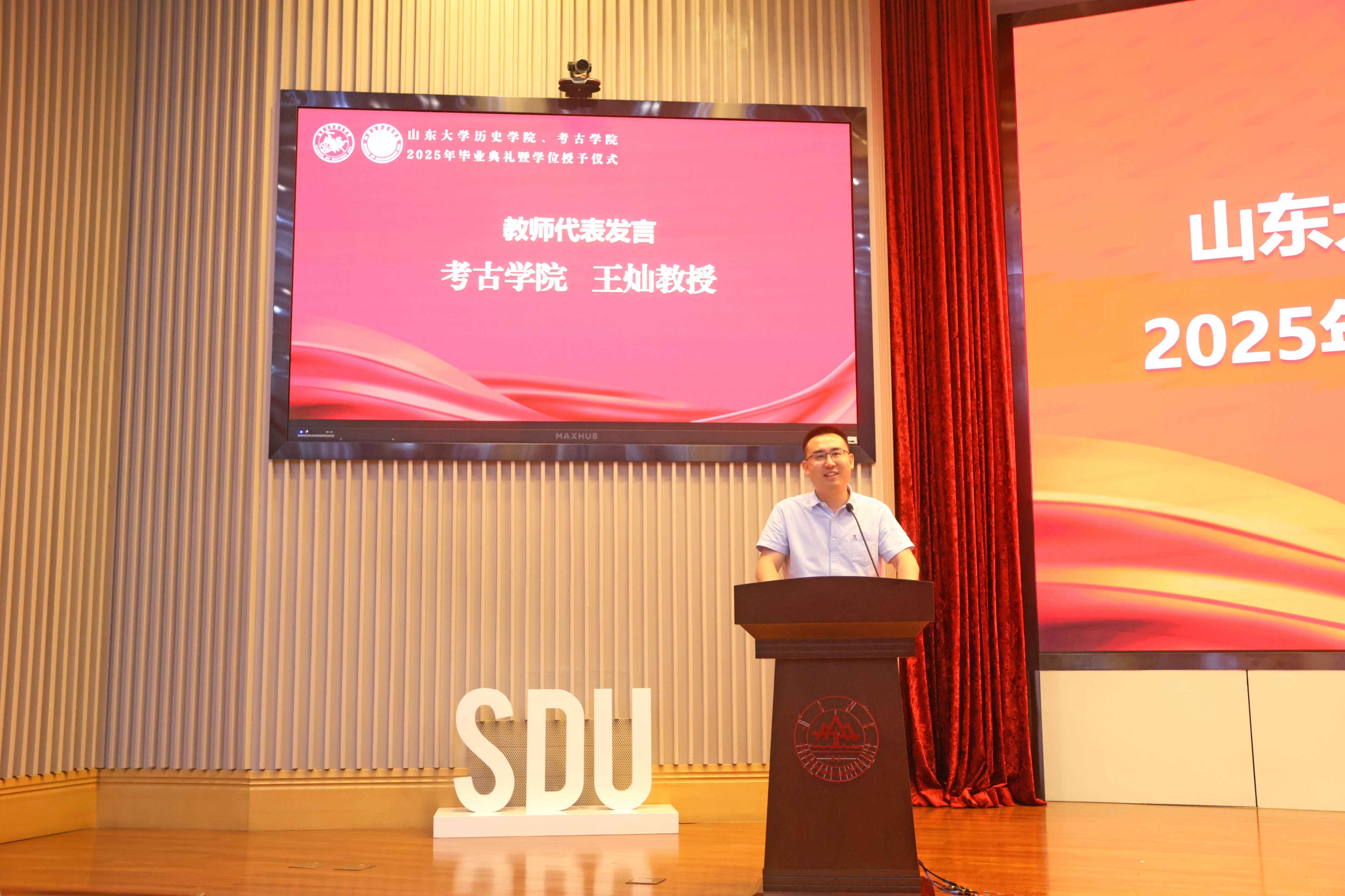王灿教授作为教师代表为毕业生送出寄语。张新刚寄语各位毕业生,毕业后要全身心投入自己的生活,找到自己真正热爱的事物,保持对世界的好奇,在漫长人生中成为更好的自己。他以古希腊英雄奥德修斯为例,希望同学们接受生命有限性,在人生旅程中成为有故事的人,把自己活成值得传颂的故事。王灿回顾了师生共同在课堂研讨、讲座思考、实习基地实践及论文创作中结下的深厚情谊,希望各位同学无论从事哪种行业,都应敬畏事实、踏实前行,以热爱与责任感成为中华优秀传统文化及人类文化遗产的守护者、解读者与传播者。最后,他祝福全体毕业生携历史智慧与考古坚韧,在人生道路上发掘无限可能。