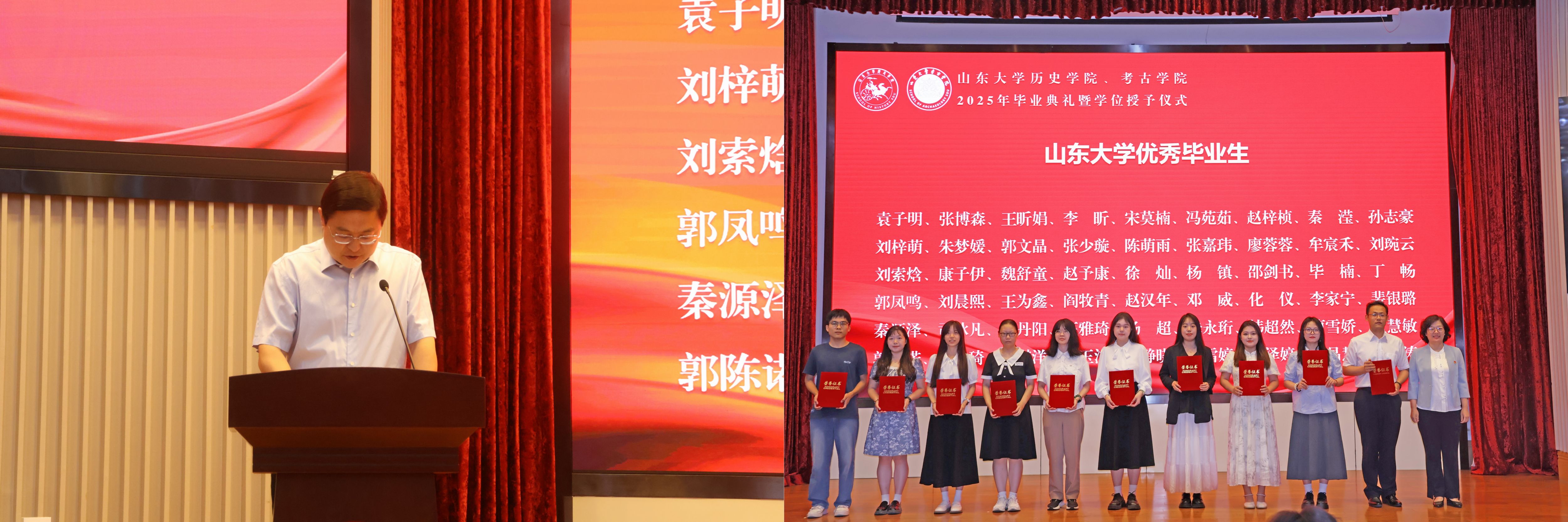 2022级考古学专业硕士郭凤鸣、2021级历史学专业本科生秦滢分别代表毕业生发言。郭凤鸣分享了自己在山大考古的八载求学时光,学科赋予的踏实守正与师友相伴的温暖情谊,让他从憧憬少年逐渐成长为他人眼中的“故事里的人”。秦滢表达了对学校、学院、师长的真挚谢意,她即将奔赴西部地区开展为期一年的支教服务工作,到祖国和人民最需要的地方发光发热。