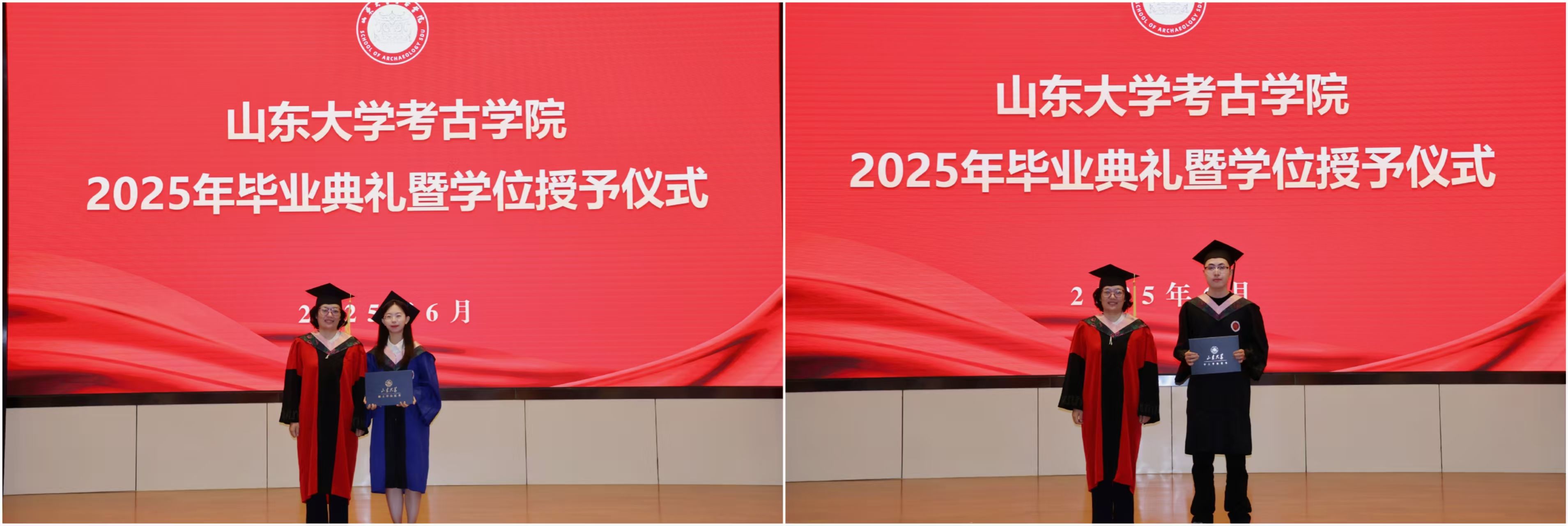 毕业典礼后,学院举行了2025届毕业生学位授予仪式。宋艳波、张新刚宣读《本科生、研究生学位授予决定》。毕业生身着学位服依次登台,王芬、代国玺逐一为本硕博毕业生拨正流苏、颁发学位证书,并合影留念。