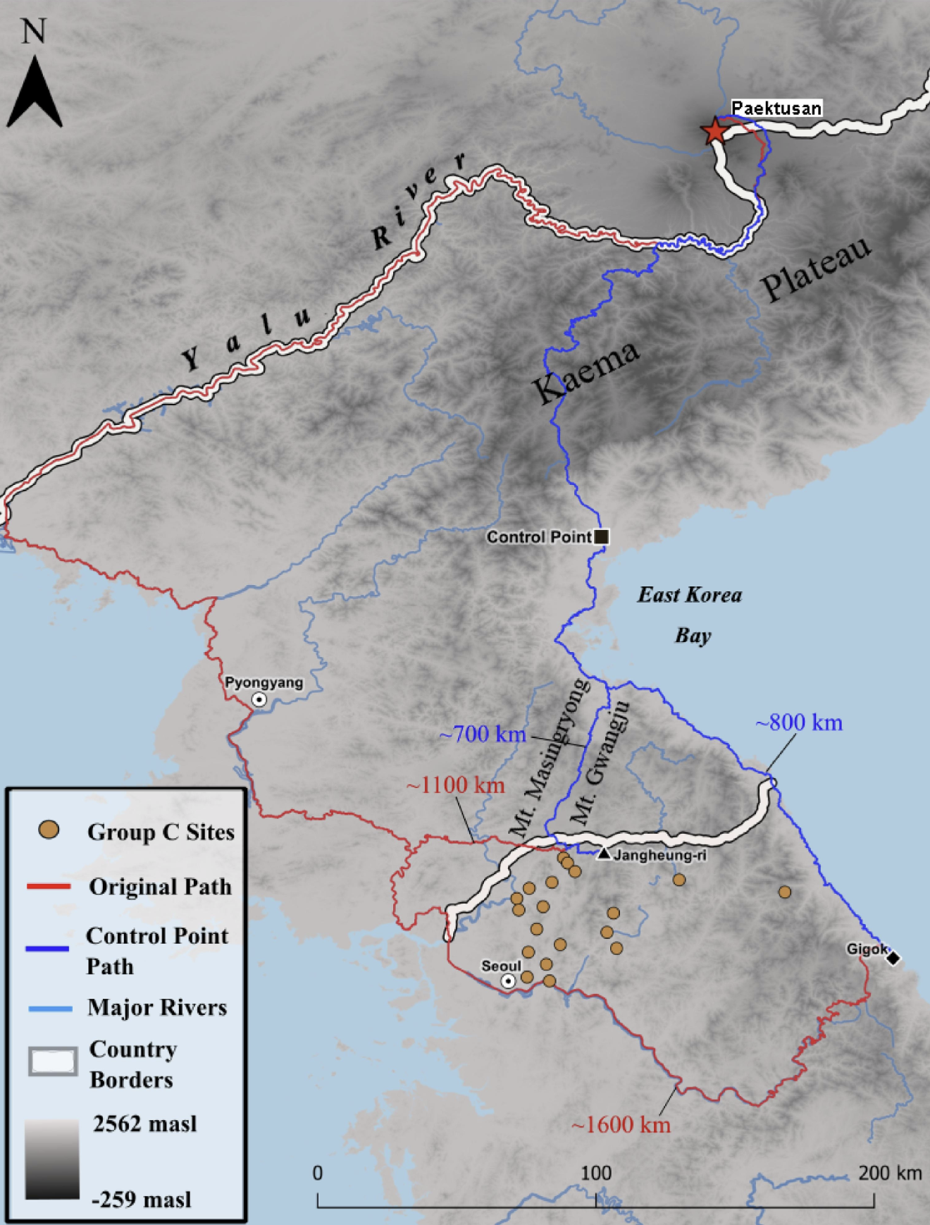 图三 长白山黑曜岩传播至韩国北部遗址的模拟路线