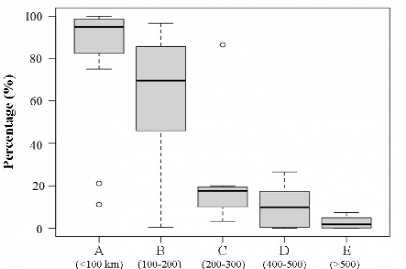 图二 与长白山不同距离范围内遗址的黑曜岩石制品占比