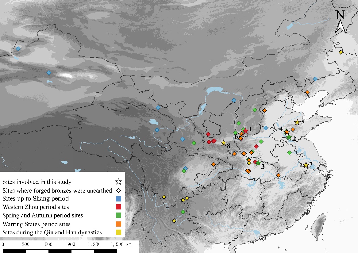 图1 研究样品的地理位置及出土锻造青铜器的遗址分布