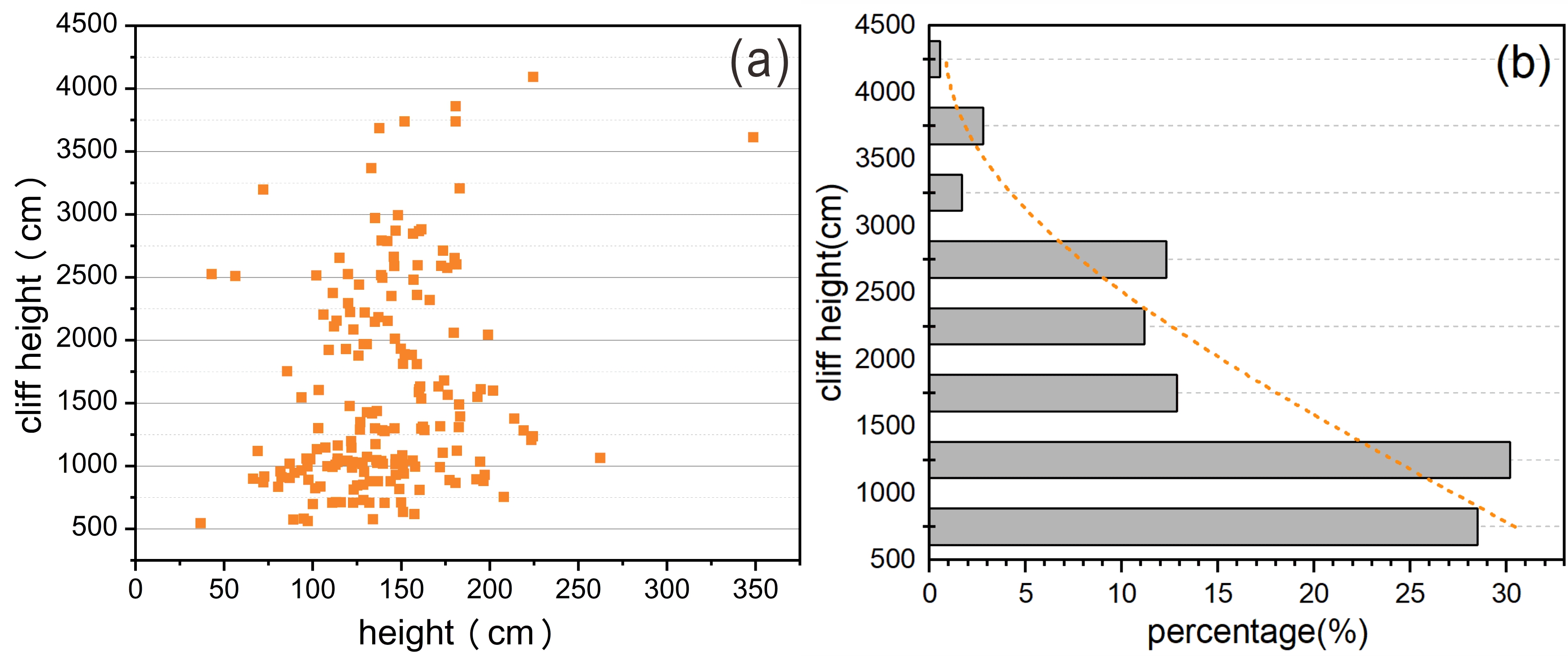 左江花山岩画位于广西壮族自治区崇左市左江两岸的绝壁之上,自上世纪50年代发现至今已有70余年的研究历史。前人对岩画的主题、族属、年代、技法、风格等多个方面展开研究,取得了丰硕的研究成果。但由于岩画所处的特殊地理环境,使研究人员难以获取岩画图像的详细信息,导致有关图像数据的研究和报道普遍缺乏。基于近景摄影测量技术和岩画数字化信息记录成果,研究团队对宁明花山岩画遗产点中保存完整的179个正身人物图像进行了身高、图像高、臂宽、腿宽、臂展长、腿展长、躯干高、胸宽、面积9个方面的数据计量与统计分析(图一、图二)。