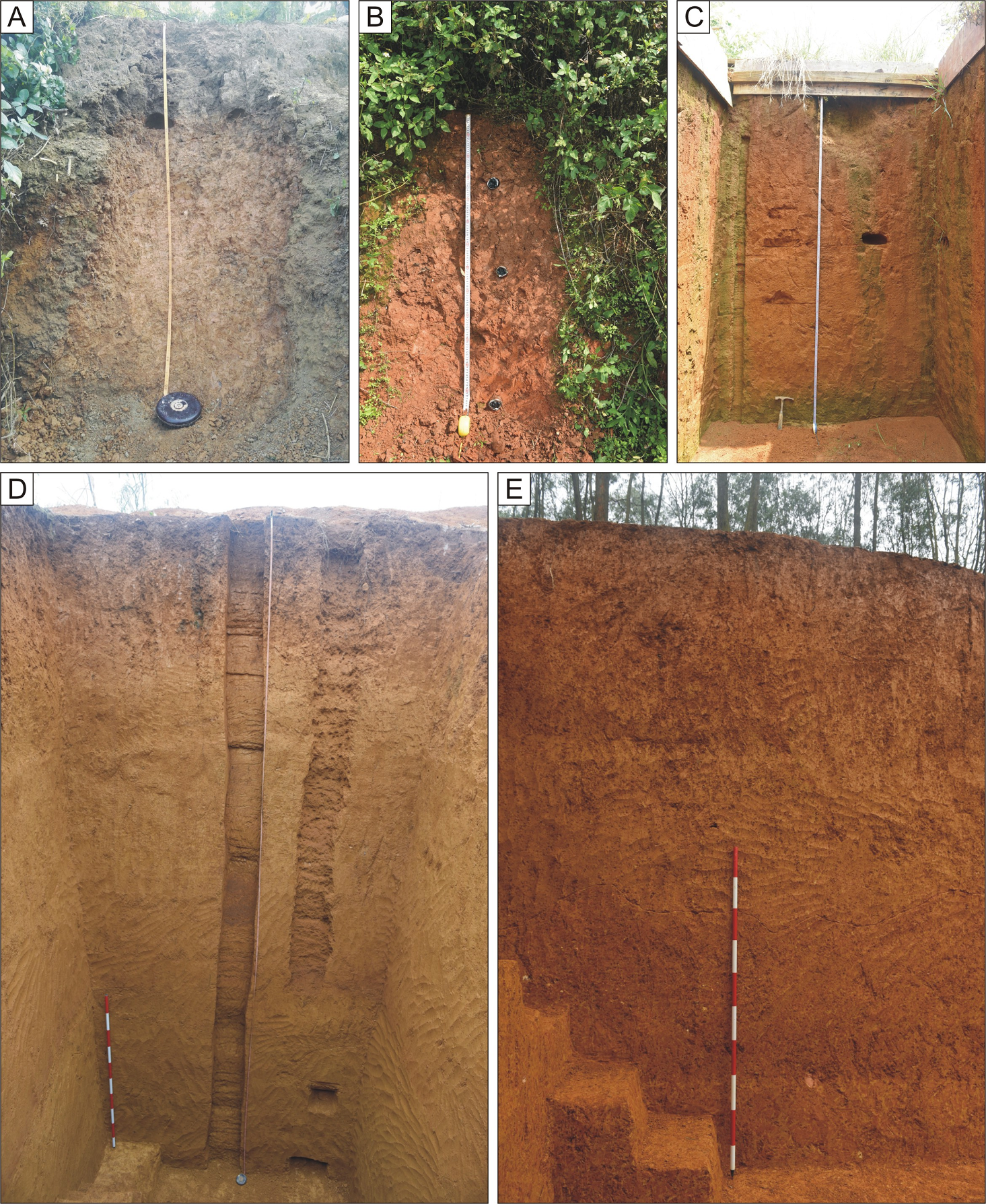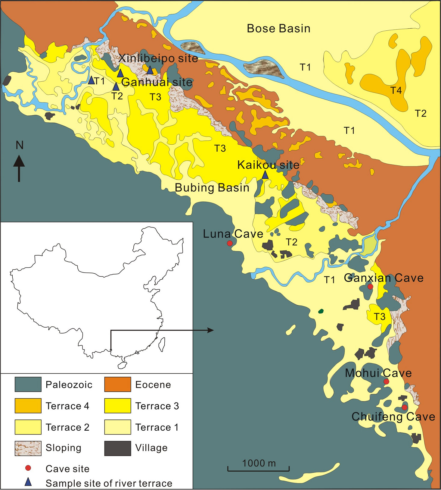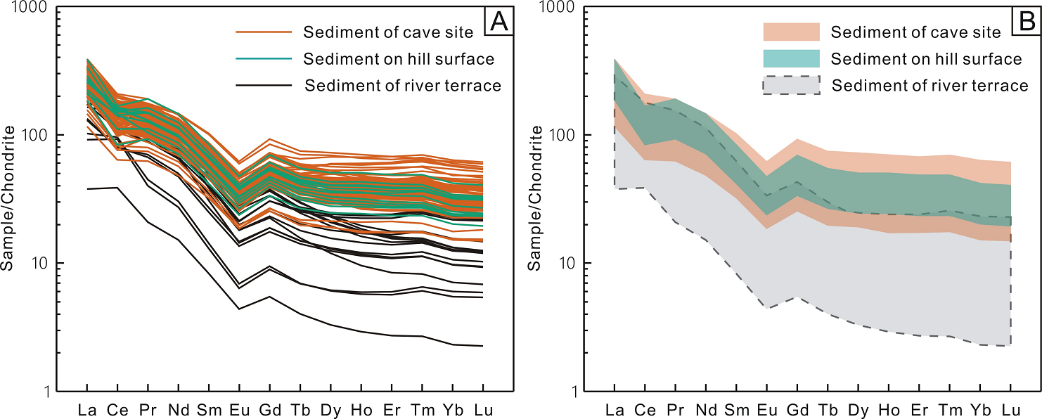 本研究系统地采集了布兵盆地陆那洞,感仙洞,么会洞和吹风洞洞穴遗址内的沉积物和这些洞穴遗址山体表面的沉积物样品(图2)。同时,还系统地采集了盆地内第一到第四级河流阶地的沉积物样品(图3)。通过分析这些样品的主量元素,微量元素和稀土元素,确定了布兵盆地洞穴遗址的沉积物来源。
