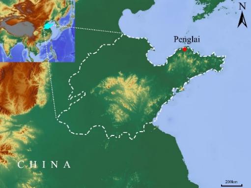 蓬莱水城位置及蓬莱三号古船发掘现场照片