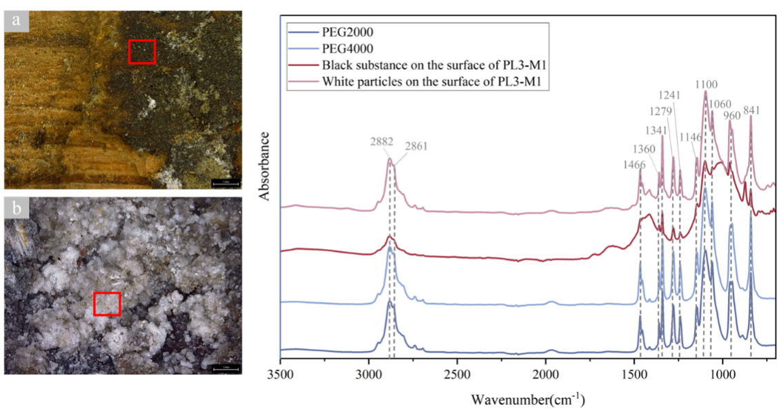 研究表明,先前的保护措施在缓解船木老化方面起到积极作用。尽管蓬莱三号古船木材有所降解,但经过保护处理的木材降解程度较轻。在初期保护阶段,船体采用聚合物PEG处理,成功缓解了开裂和变形,不仅加固了木材,还使其达到理想干燥状态。然而,PEG材料在表面过量积累导致木材变黑,影响了沉船外观,这暴露出PEG在木质文物保护处理中的潜在缺陷。此外,铁(如硫铁化合物)和钙质沉积物在木材表面及内部积累,随着时间推移,这些沉积物会加速木材酸化和降解,增加长期保护工作难度。