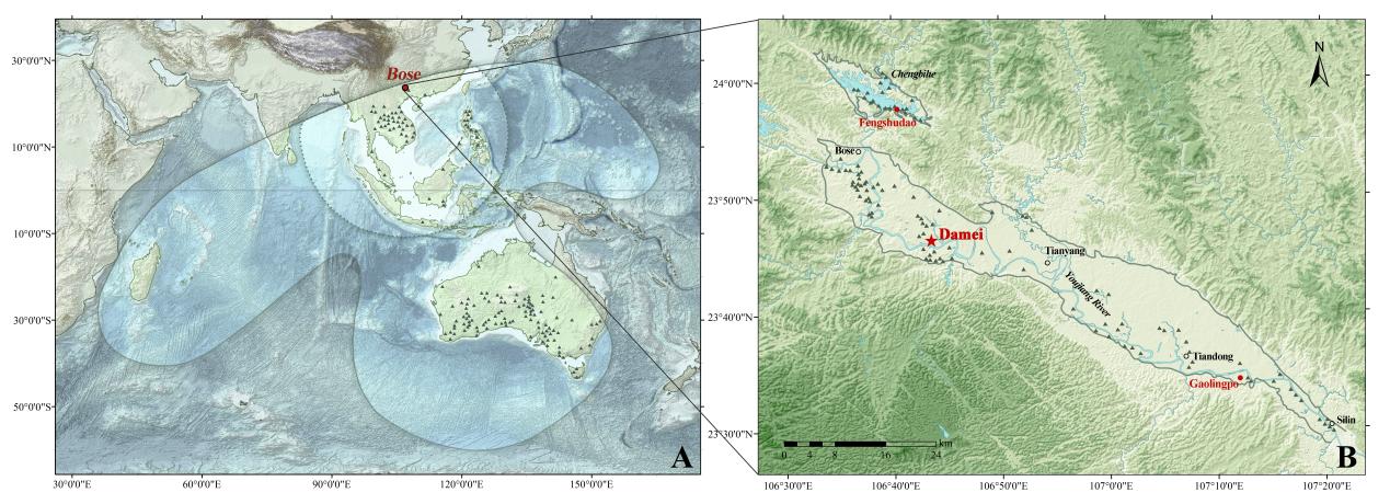 图1.亚澳玻璃陨石散布区范围图(左)及百色盆地旧石器遗址分布图(右)