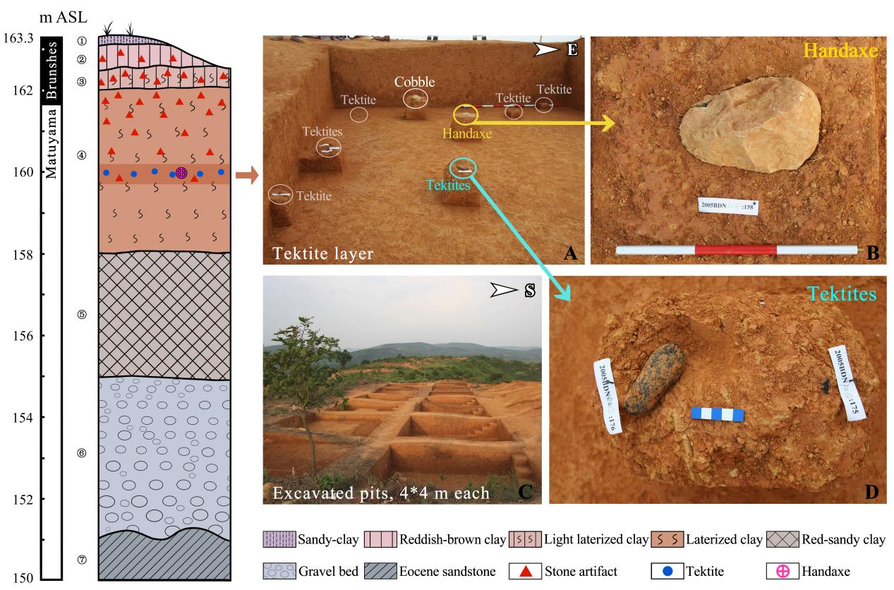 大梅南半山遗址是百色盆地右江第四级阶地旧石器遗址群的代表性遗址。在2005年的发掘中,出土了共210件石制品和155枚玻璃陨石,并在同一层位发现了手斧和多颗玻璃陨石(图2)。这也是学界首次在第四纪沉积物中发现并出土如此密集的原位埋藏玻璃陨石层。大梅南半山遗址通过考古发掘出土的手斧和大量玻璃陨石,为解决百色盆地阿舍利石制品的年代争议提供了契机。