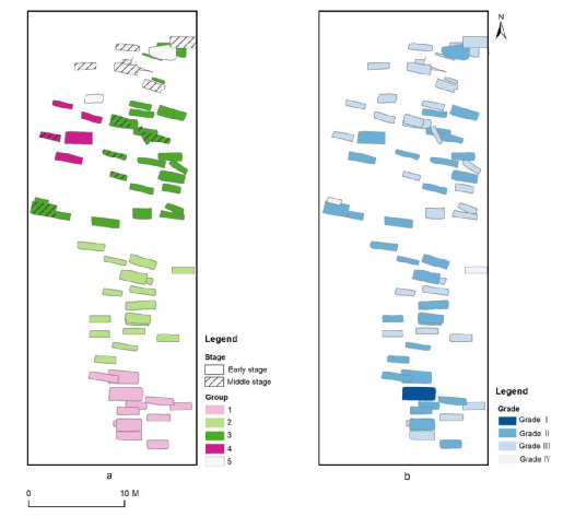本研究选取焦家遗址2016-2017年度发掘的一处完整墓区(共计86座墓葬),系统运用地理信息系统(GIS)空间分析方法,整合墓葬面积、棺椁结构、随葬品组合等多元信息,创新性地采用三种定量空间建模技术(加权泰森多边形分析、K近邻空间约束聚类、核密度估计)构建了一套可量化、可验证、可复现的计算分析流程,从历时性演变的角度解析了该墓区所反映的社会组织结构、社会内涵的历时性变迁等问题,为墓葬考古学研究提供新的视角和方法。