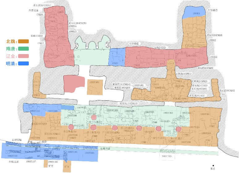 云冈石窟窟前遗址考古发掘的主要收获:除了昙曜五窟(第16-20窟)窟前北魏时期遗址河堤和坡道遗址外,北魏、辽金时期各区域洞窟(或者各组洞窟)窟前的木结构建筑窟檐遗址和北魏洞窟开凿工程与洞窟坍塌以及造像损毁修复情况等则是石窟寺窟前遗址比较关注的问题。