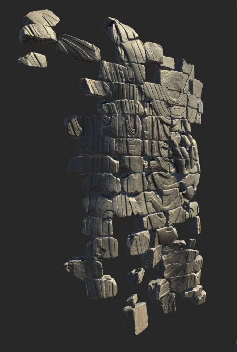 云冈石窟第20窟是早期大像窟之一,窟内为三世佛布局,惜西立佛现已残损,仅仅保留着部分头光、双脚以及莲台遗迹。1992年窟前考古发掘中,在洞窟外发现西侧立像崩塌的身躯残件遗物。通过对崩塌下部分残件整理和西侧大佛复原,确认这尊着通肩式袈裟佛衣立像,其与东侧立佛的形制、衣饰大致相似。