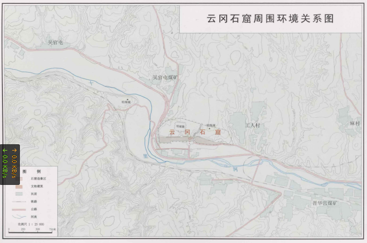 据郦道元《水经注》记载:“武周(州)川水又东南流,水侧有石祇洹舍并诸窟室,比丘尼所居也。其水又东转,迳灵岩南,凿石开山,因崖结构,真容巨壮,世法所稀。山堂水殿,烟寺相望,林渊锦镜,缀目新眺。”云冈石窟位于大同市城西16公里处的武州山南麓,武州川北岸。雕刻于侏罗系大同统和云冈统上部岩层的一个砂岩透镜体上,东西绵延约820米,第1窟到第20窟的主要洞窟几乎处于同一水平线上,整个洞窟被南北向大冲沟(东谷、西谷)分为东部、中部和西部三个区域石窟群。现存大小编号洞窟254个,主要洞窟45个,附属洞窟209个,各类佛教造像59000余尊(身)。从云冈石窟往西,有三处小型石窟:括鲁班窑石窟、吴官屯石窟、焦山寺石窟,这样石窟群就绵延约三十余里,此外,还有鹿野苑石窟。