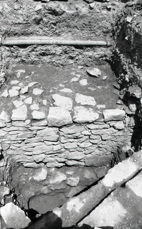 首先,北魏时期的河堤、坡道基本情况。1992年考古发掘是为了配合云冈石窟保护维修工程,尽管发掘面积十分有限,但是在距离昙曜五窟洞窟前立壁24-30米处,通过第20窟前南部探方和选择其他洞窟前探方试掘,发现了一段北魏时期修筑的河堤墙体,河堤呈东西方向,墙体用石块垒砌,长度约100多米。在这道河堤与第20窟前台基中央对应位置有一条南北向坡道,其中这条坡道的东西两侧石墙直接深入进河堤墙体之内,反映出河堤与坡道关系。