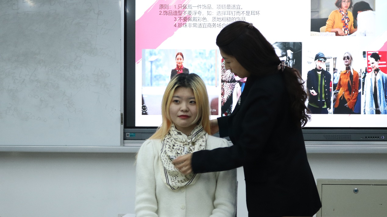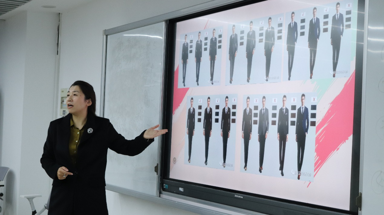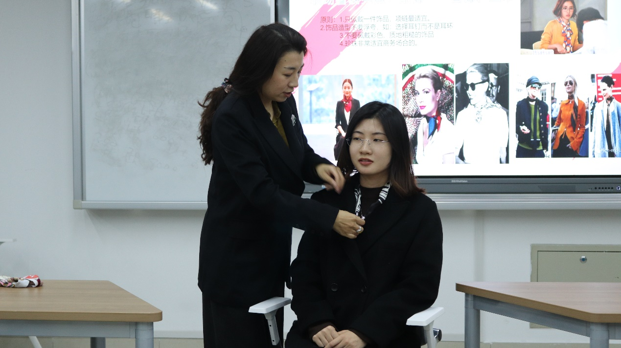 首先,高娜强调了职场形象塑造的重要性。特别是在形成第一印象时,一个干练、专业的形象能够迅速赢得他人的信任和尊重,为职业生涯开启一个良好的开端。在谈到职场形象的细节时,高娜特别提到了发型与妆容的管理。她表示,整洁、得体的发型能够展现出个人的精神面貌和专业度,而精致的妆容则能够提升个人的气质和自信。高娜以职场视角,为同学们详细讲解了职场穿搭的TPOR原则、穿搭技巧和注意事项。从职业装的选择到配饰的搭配,从颜色搭配到场合着装,内容既实用又具前瞻性。并通过现场示范男女站姿坐姿、演示丝巾多种系法等生动形象的讲解,使同学们对职场形象有了更加深入的了解。