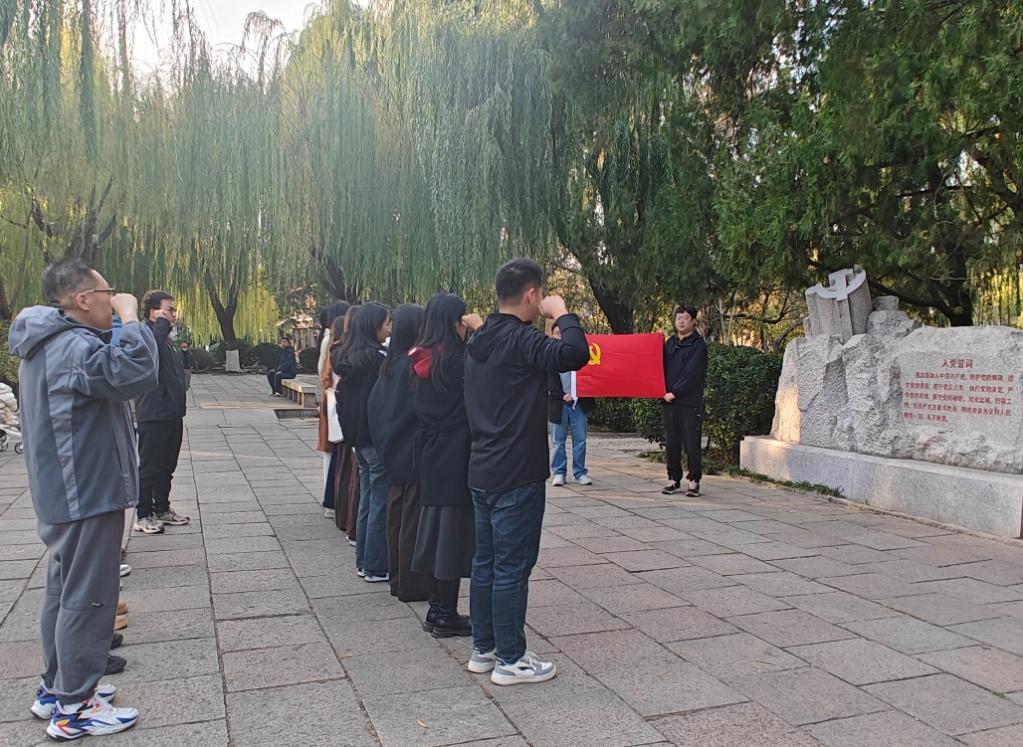 参观之后,支部党员同志们还瞻仰了中共山东省委领导机关旧址(1925-1927)。在北侧的美铭广场,瞻仰了王尽美、邓恩铭同志塑像。在塑像前,支部书记董志浩带领全体党员面对党旗,重温入党誓词。