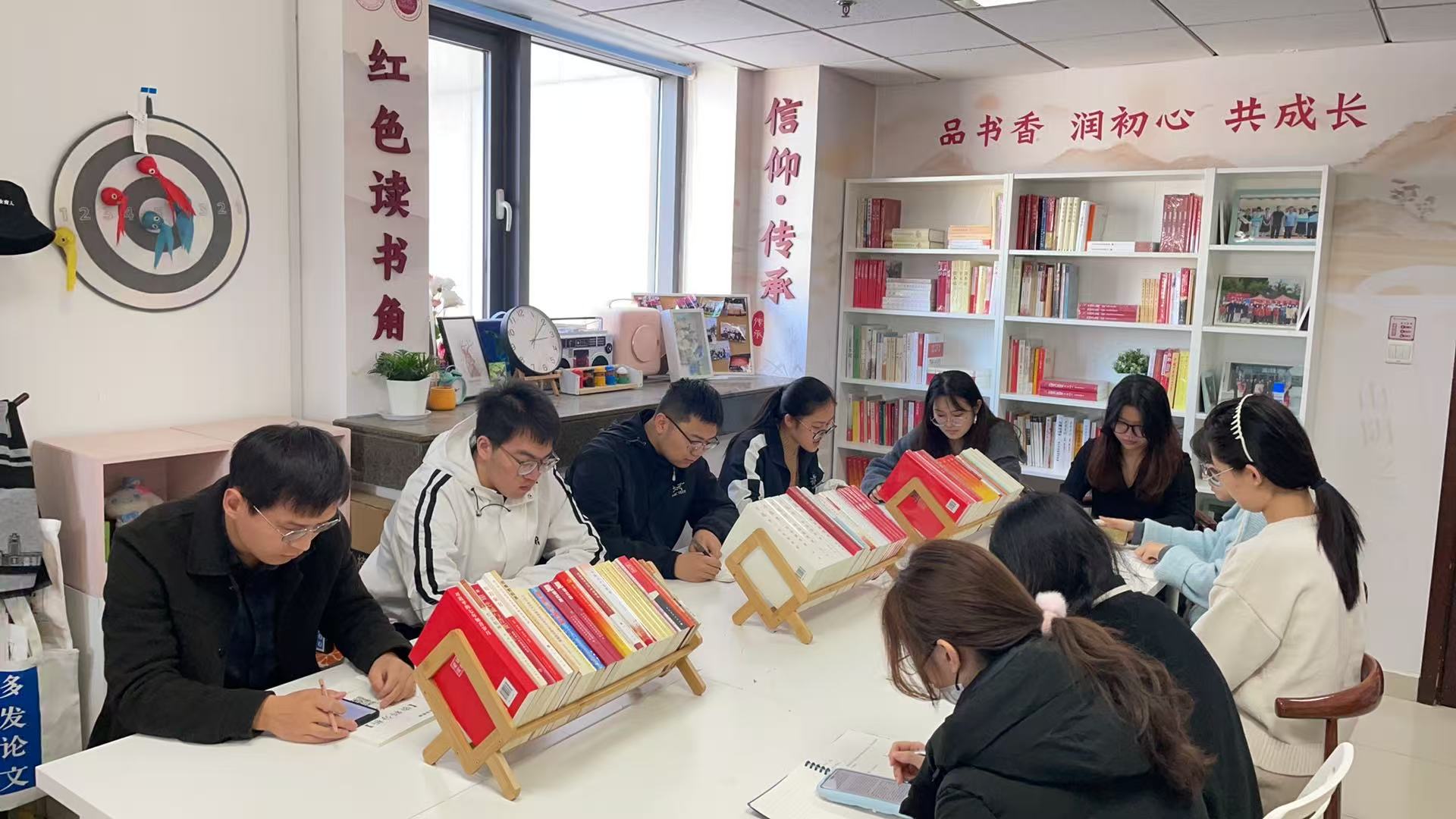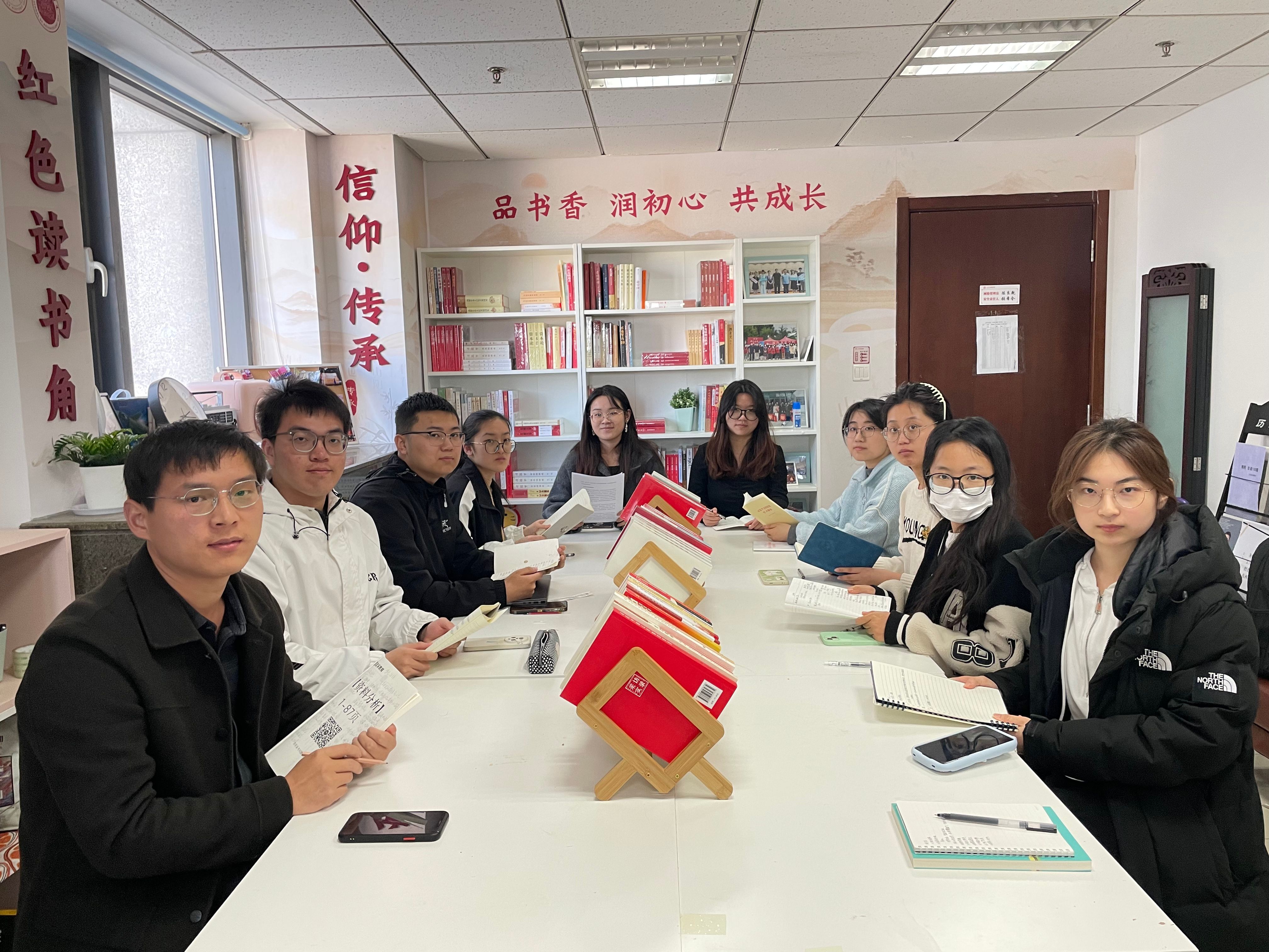 本科生党支部“知行先锋”团队在知新楼A1020“红色读书角”,开展学习《习近平文化思想学习纲要》主题“先锋读书会”活动。