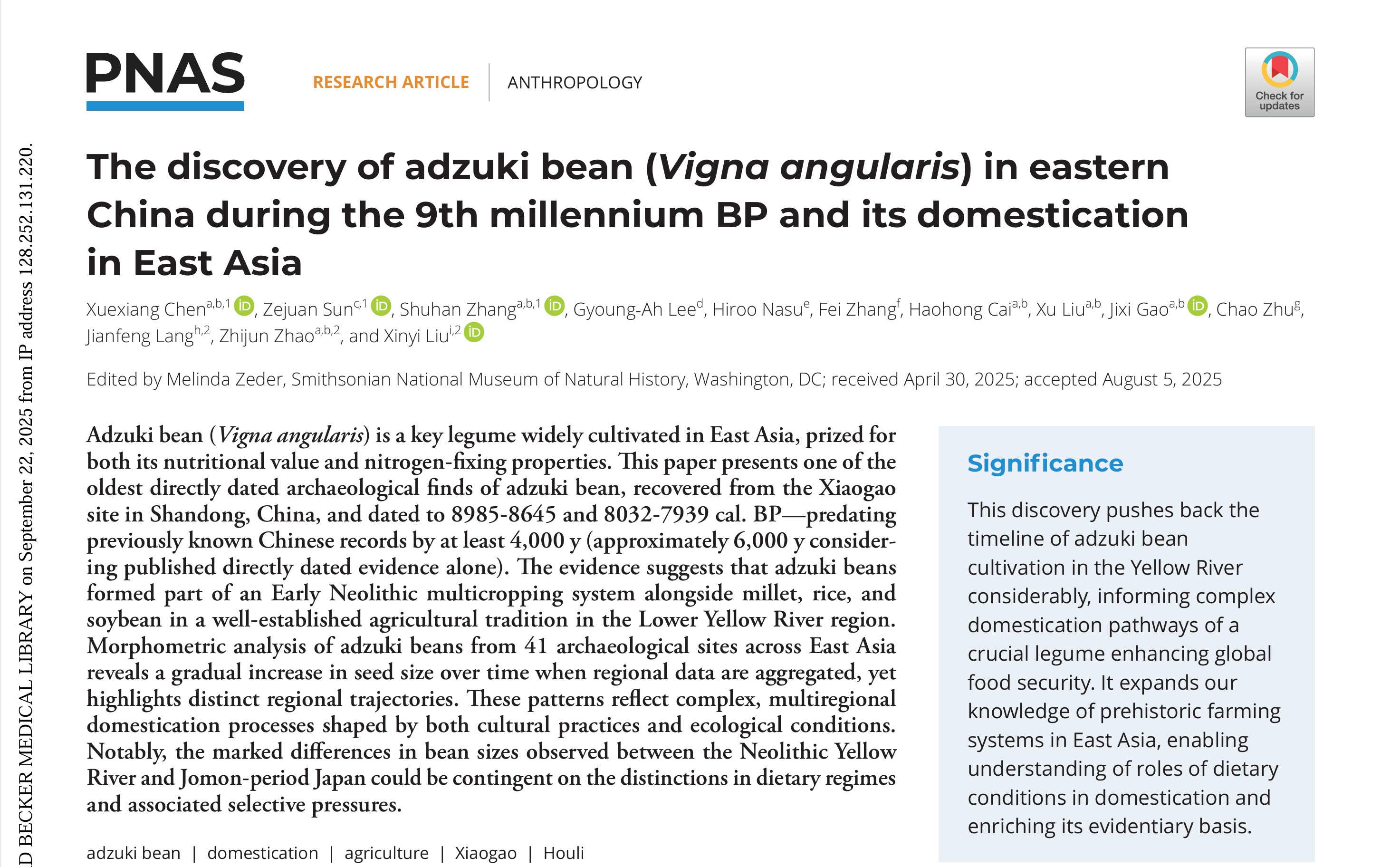 9月23日,木瓜视频 与圣路易斯华盛顿大学、山东省文物考古研究院、安徽大学、俄勒冈大学、冈山理科大学、中国社会科学院考古研究所联合组成的国际团队,在《美国科学院院刊》(Proceedings of the National Academy of Sciences of the United States of America,PNAS)发表最新研究成果“The discovery of adzuki bean (V. angularis) in Eastern China during the 9th millennium BP and its domestication in East Asia”。团队通过植物考古和碳-14测年研究方法,在山东淄博后李文化小高遗址发现了距今9000年前的炭化小豆遗存,比此前中国境内发现的炭化小豆提早了4000年(比有直接测年数据的炭化小豆提前了6000年)。